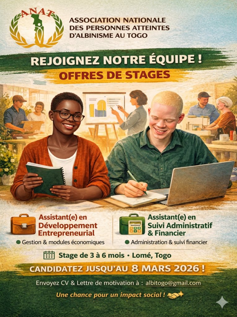 🌟 Dans le cadre du lancement de notre Centre d’Insertion Socioprofessionnelle (CISP), l’Association Nationale des Personnes Atteintes d’Albinisme au Togo (ANAT) recherche deux stagiaires professionnels pour accompagner le développement de ce projet pilote ambitieux.